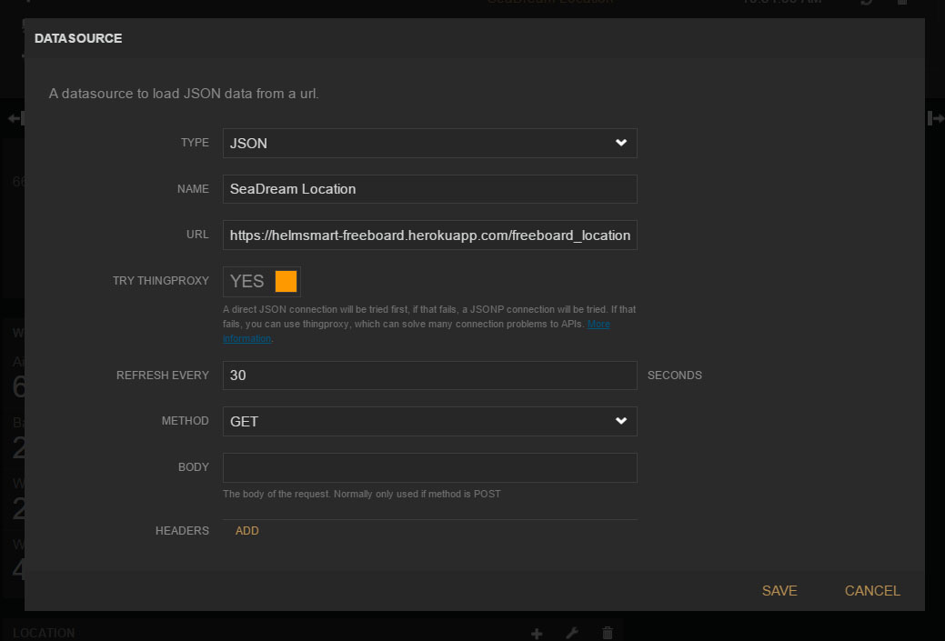 | To use the API with the Freeboard.io dashboards simply enter the URL with parameters as described below in the JSON Datasource. Be sure to enter a update interval and select the THINGPROXY option to enable cross-domain access. EXAMPLE |